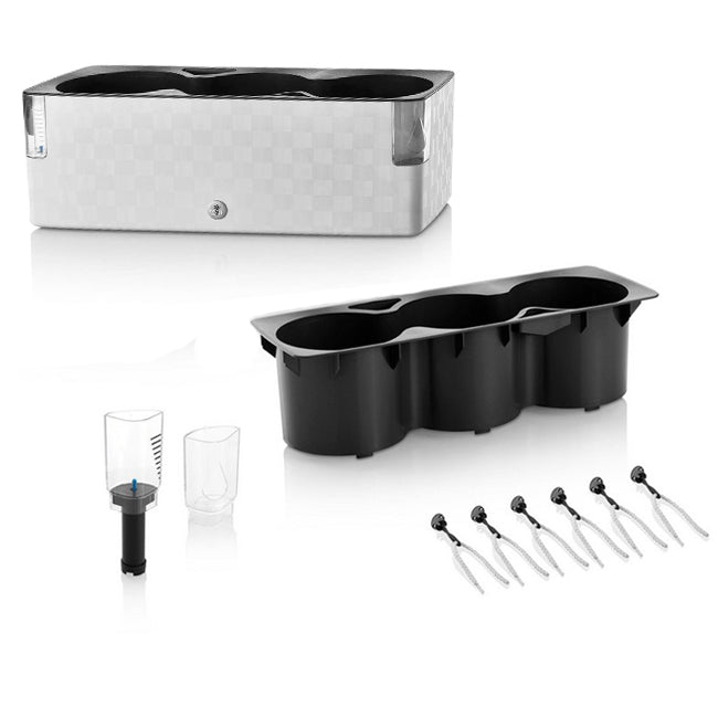 - Contenu : 1 pot extérieur avec témoin flotteur et compartiment d'arrosage, 1 récipient intérieur segmenté en trois, 6 filaments absorbants